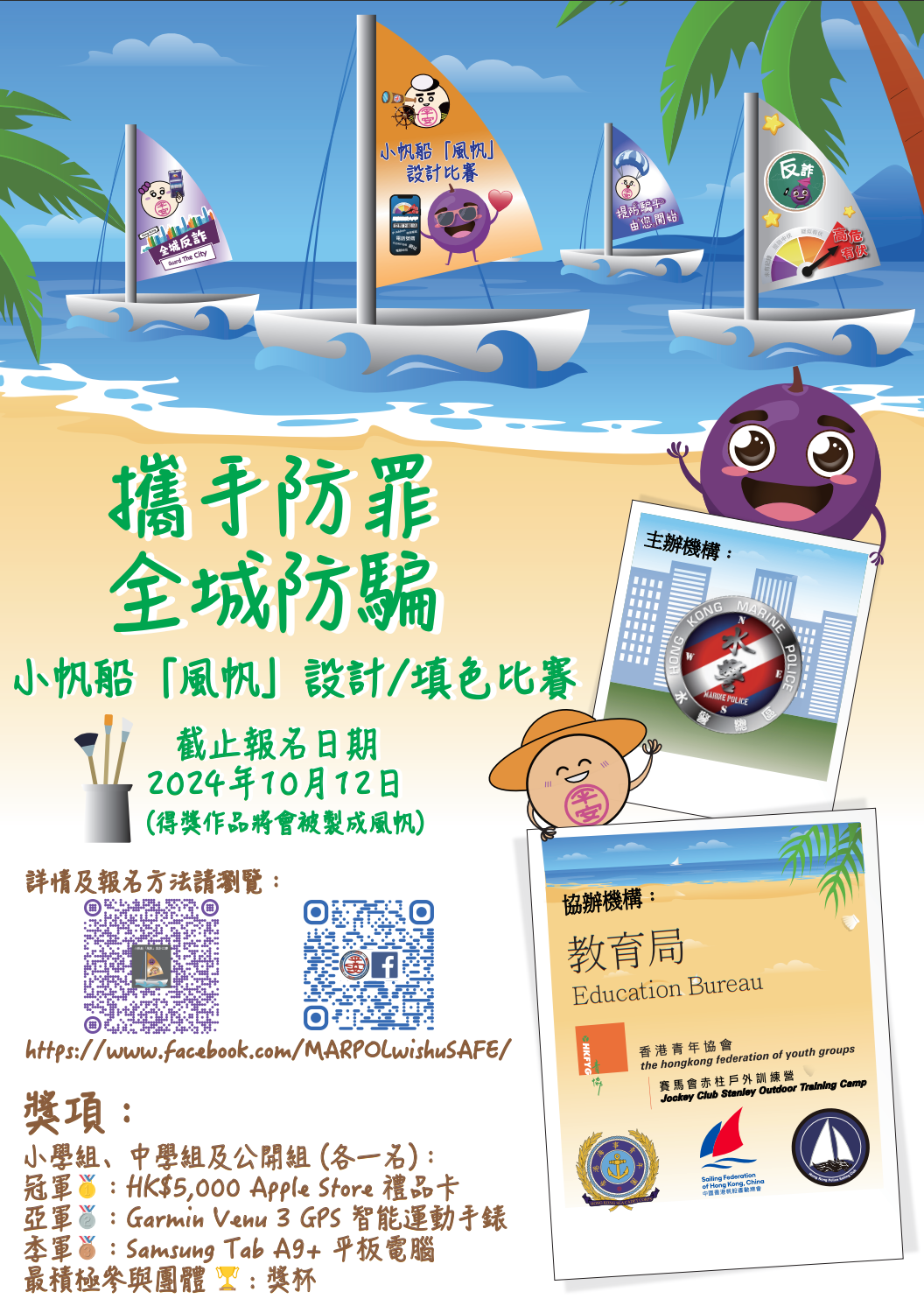 主題:水警總區防止罪案辦公室致力宣傳防騙•防罪資訊,現藉着舉辦「攜手滅罪•全城防騙」小帆船風帆設計比賽,鼓勵學生和市民與警方攜手,發揮無限創意,將防騙•防罪資訊推廣開去。